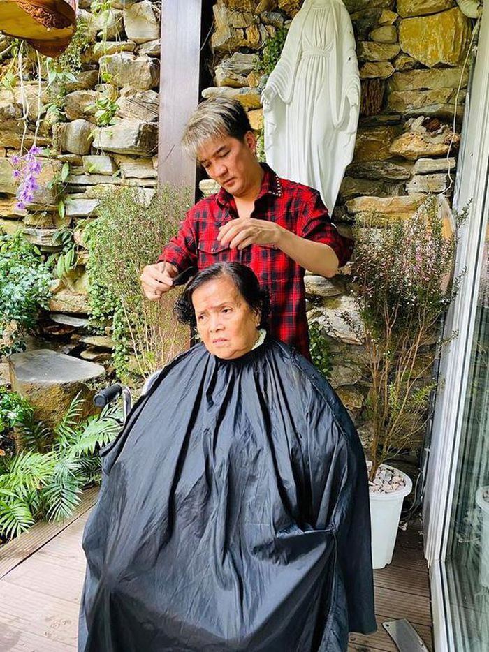 Đàm Vĩnh Hưng cắt tóc cho mẹ - bà Trần Thị Thọ - khi ở nhà tránh dịch hồi đầu tháng 8.
