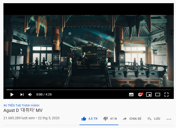 Với nước đi hoàn toàn không lường trước được, vào ngày 22/5 vừa qua, Agust D (nghệ danh khi hoạt động solo của SUGA) đã bất ngờ "đánh úp" khán giả bằng MV cổ trang xen lẫn hiện đại "Daechwita". Ca khúc nằm trong mixtape thứ 2 trong sự nghiệp của SUGA mang tên "D-2" cũng là sản phẩm tiếp theo của anh sau "Eight" kết hợp với IU. Với màn cameo cực "lầy" của Jin và Jungkook cùng chất nhạc hip-hop ấn tượng, MV "Daechwita" đã mang về hơn 20 triệu lượt xem, hơn 4,5 triệu lượt thích và từng "chễm chệ" tại top 6 trending Việt Nam.