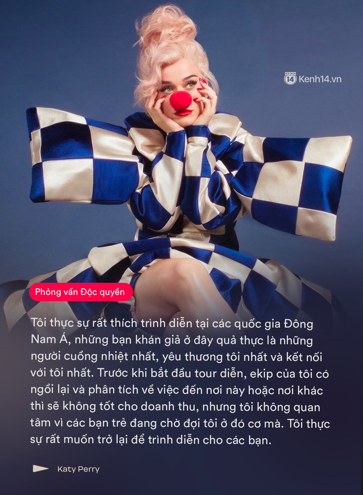 Chúng tôi đã trao đổi với Katy Perry về việc cô đã đến Việt Nam 2 lần và rất mong muốn chào đón cô trở lại trong một concert. Katy nhớ rõ mình đã đến đất nước chúng ta 2 lần và rất hào hứng khi nhắc đến fan Việt. Rất hi vọng qua buổi nói chuyện này, Katy Perry và ekip sẽ lưu ý nhiều hơn đến khán giả tại Việt Nam khi xây dựng lịch trình cho tour diễn vào năm 2021.