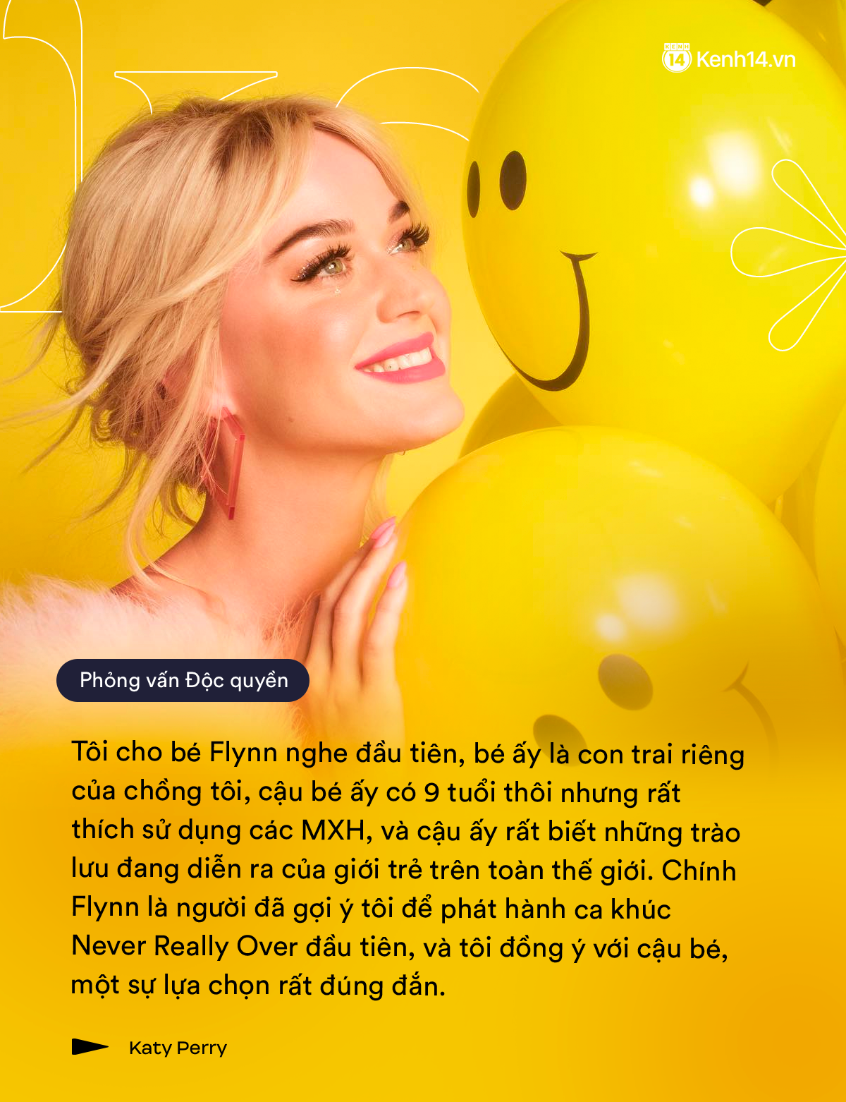 Tôi cho bé Flynn nghe đầu tiên, bé ấy là con trai riêng của chồng tôi (Orlando Bloom), cậu bé ấy có 9 tuổi thôi nhưng rất thích sử dụng các MXH, nhất là TikTok và cậu ấy rất biết những trào lưu đang diễn ra của giới trẻ trên toàn thế giới. Chính Flynn là người đã gợi ý tôi để phát hành ca khúc Never Really Over đầu tiên, và tôi đồng ý với cậu bé, một sự lựa chọn rất đúng đắn. Sau đó tôi có gửi cho một số người bạn đã chơi với tôi 20 năm rồi, rồi một số người chị em trong gia đình nữa.